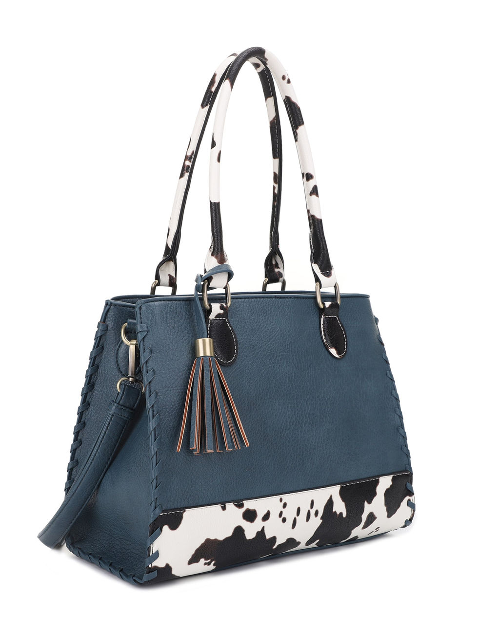 The Jessie James Montana Satchel Bag in teal delivers standout style with cow print accents and whipstitch trim. Its lock-and-key concealed carry compartment offers discreet storage, making it a functional yet eye-catching everyday bag.